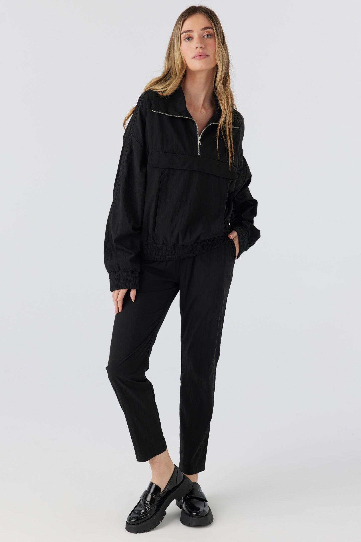 The Mia Half Zip Jacket is the perfect, easy to wear and designed to wear back to our Madison Pant. The fit is relaxed with a dropped shoulder and slightly oversized fit throughout the bodice with a smocked waist and sleeve cuff. Featuring an oversized rib collar with quarter zip front detail, flat felled seams for an elevated construction detail, front kanga pocket with side pocket entry & flap with hidden zipper to allow the option for easily transporting small objects, a storm flap design detail at the back to give a true outerwear design detail element.