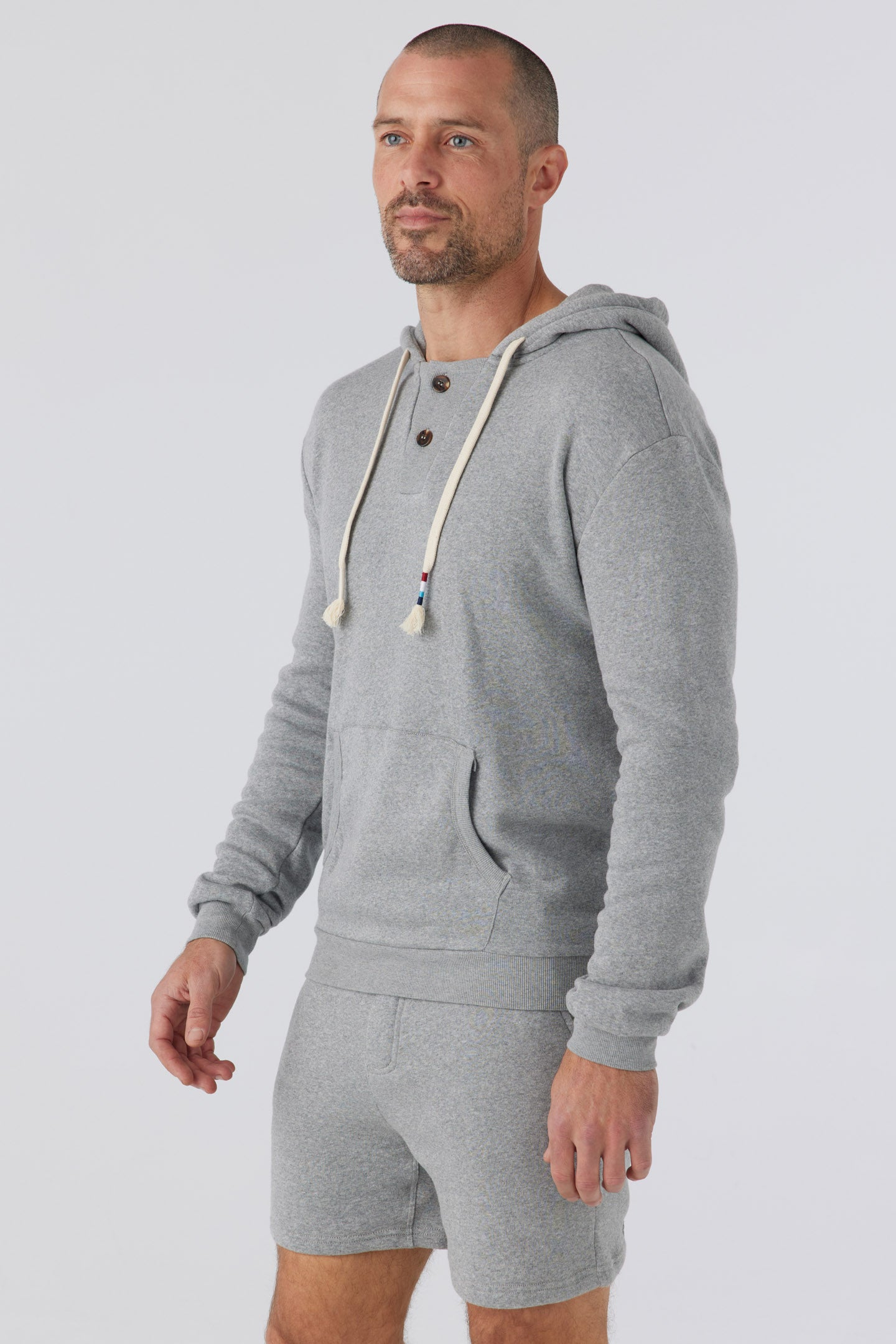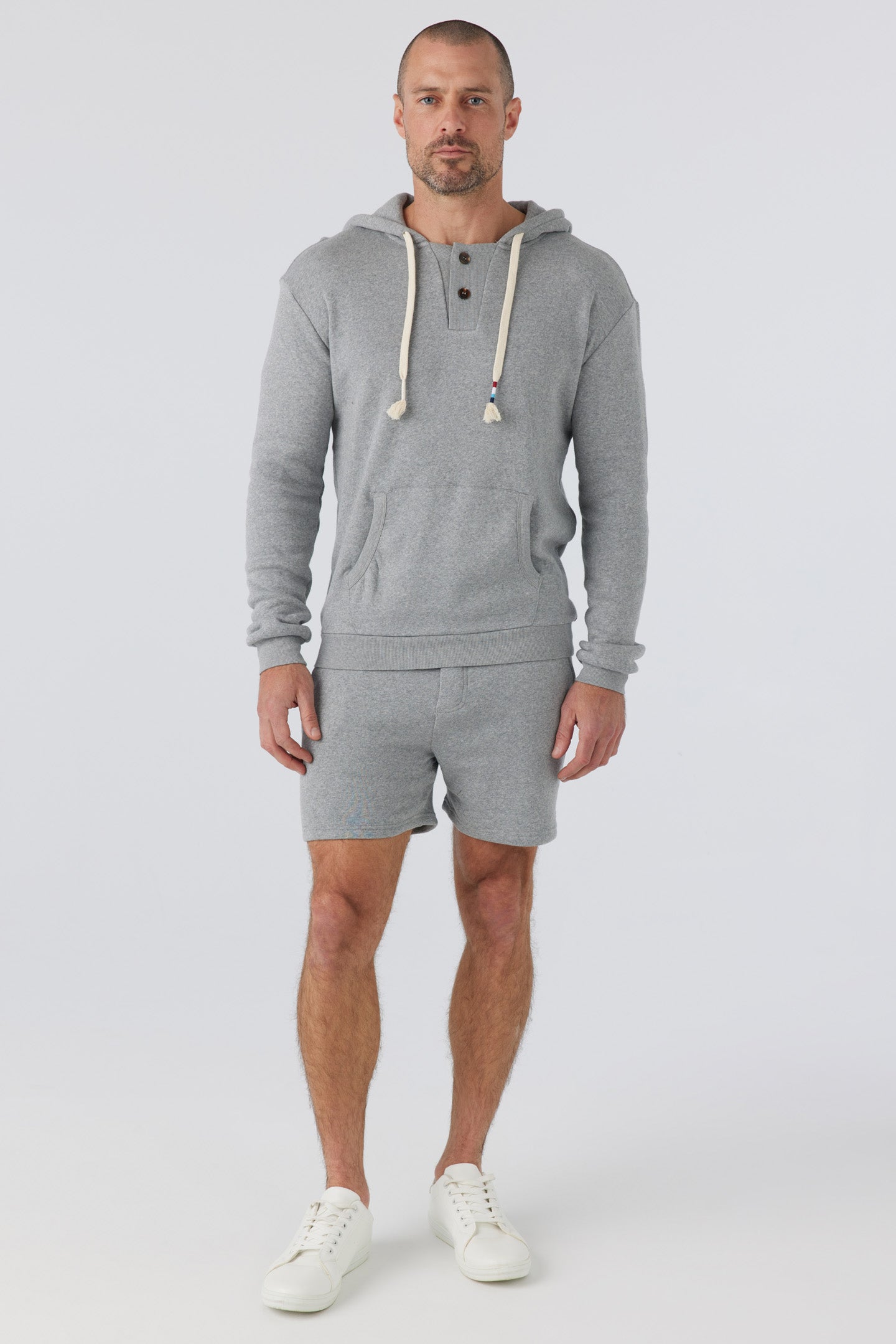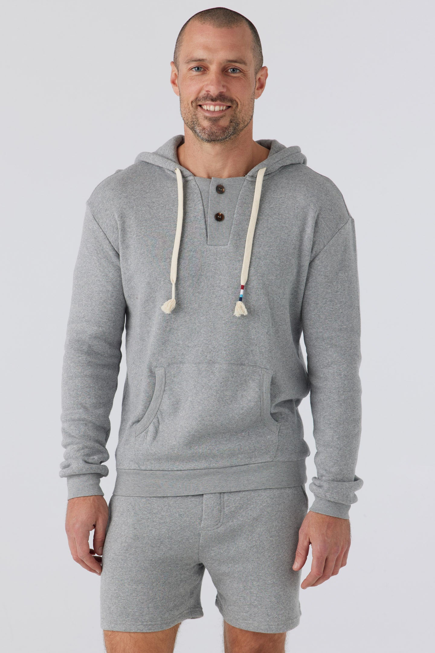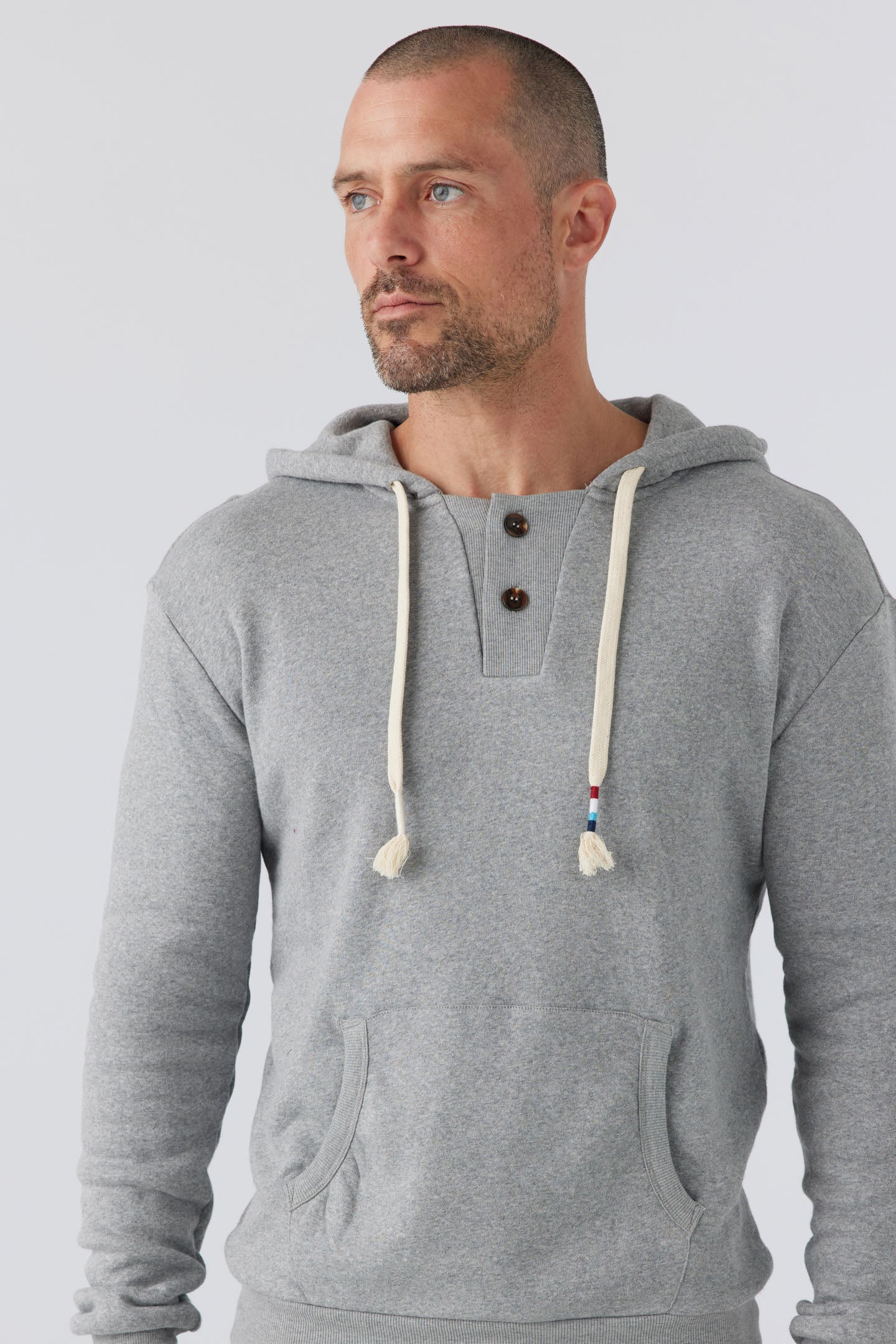 A Sol Angeles essential fit with a vintage collegiate design featuring a unique rib inset button placket at collar and kanga pocket with rib trim at pocket openings.