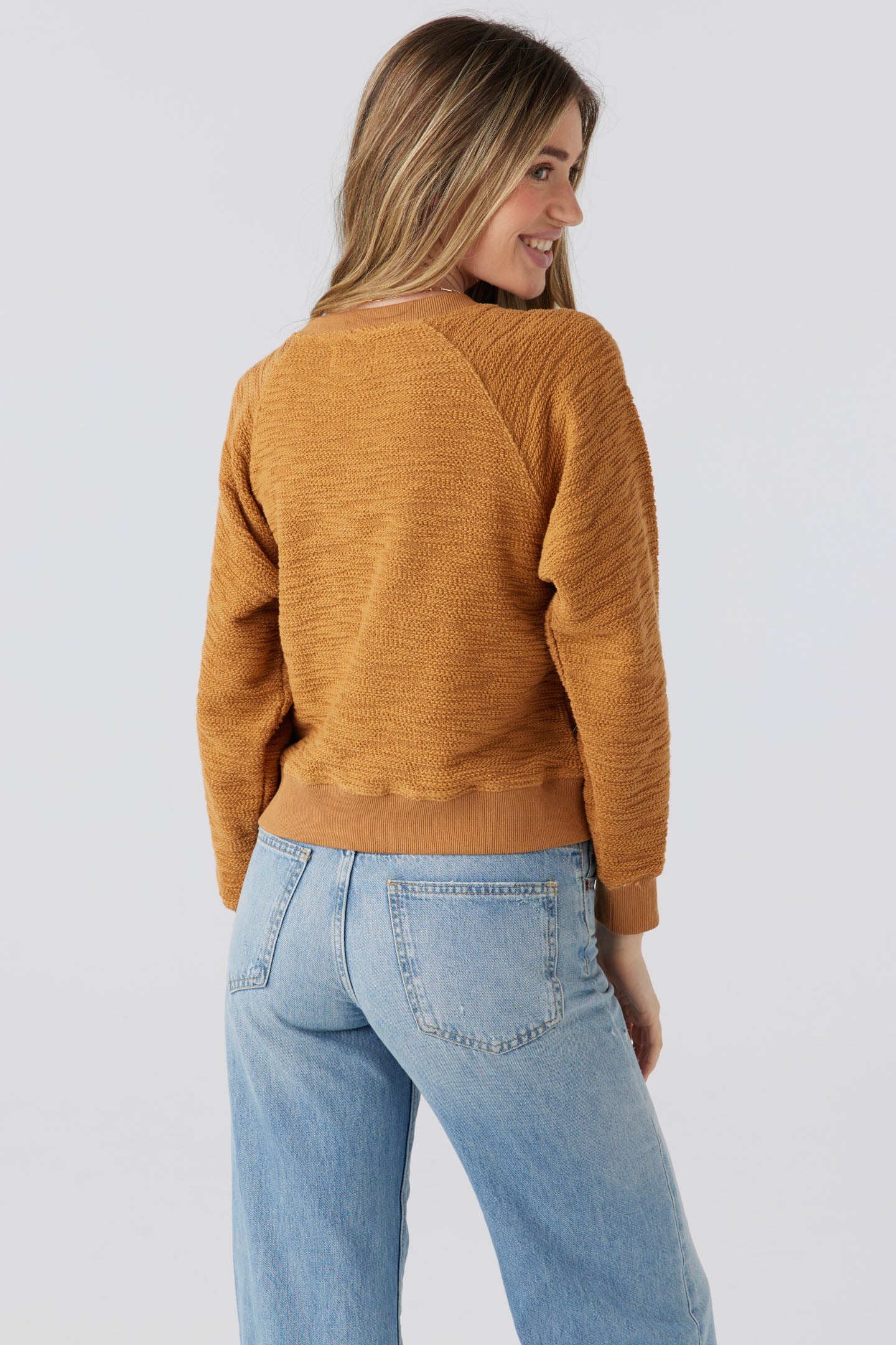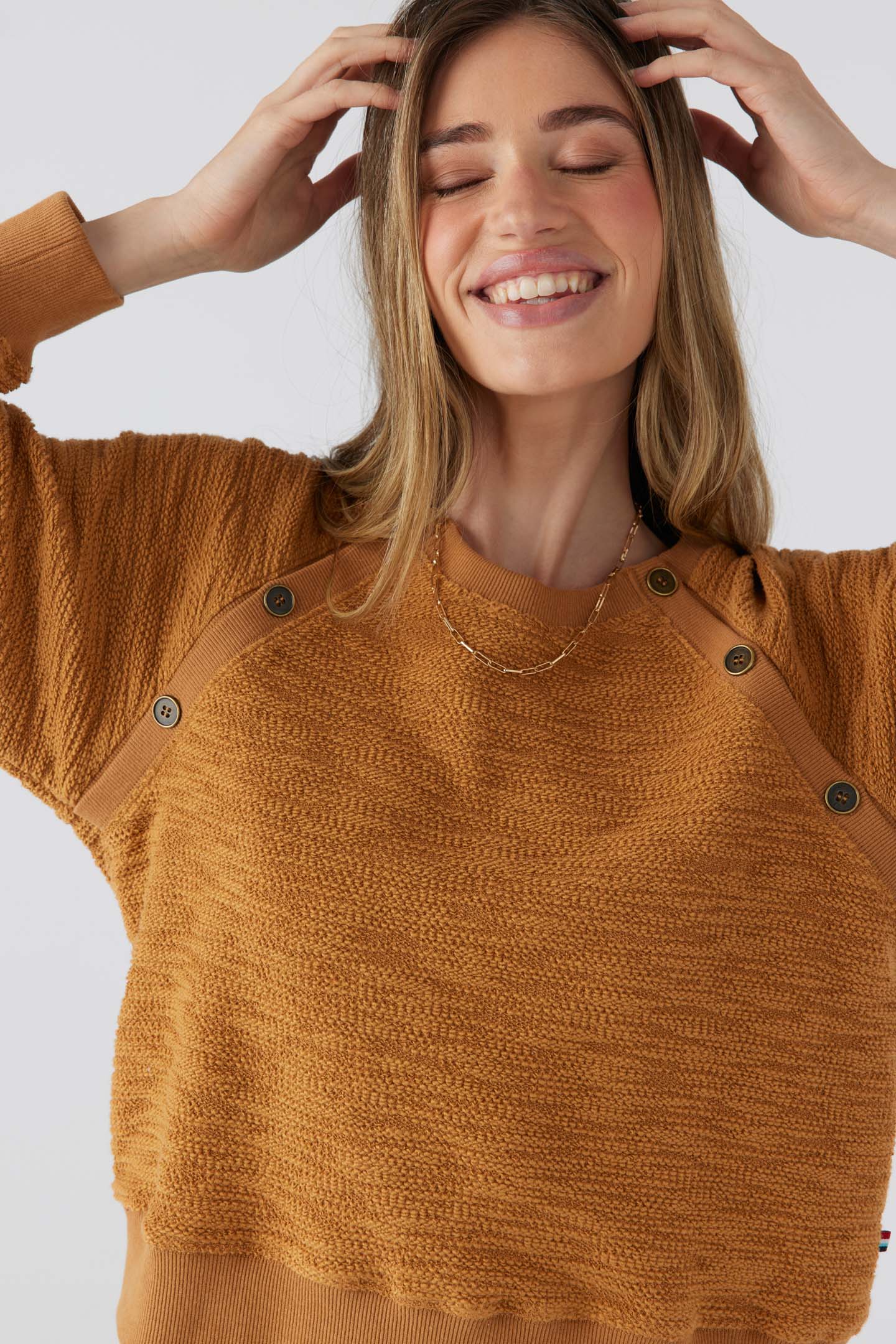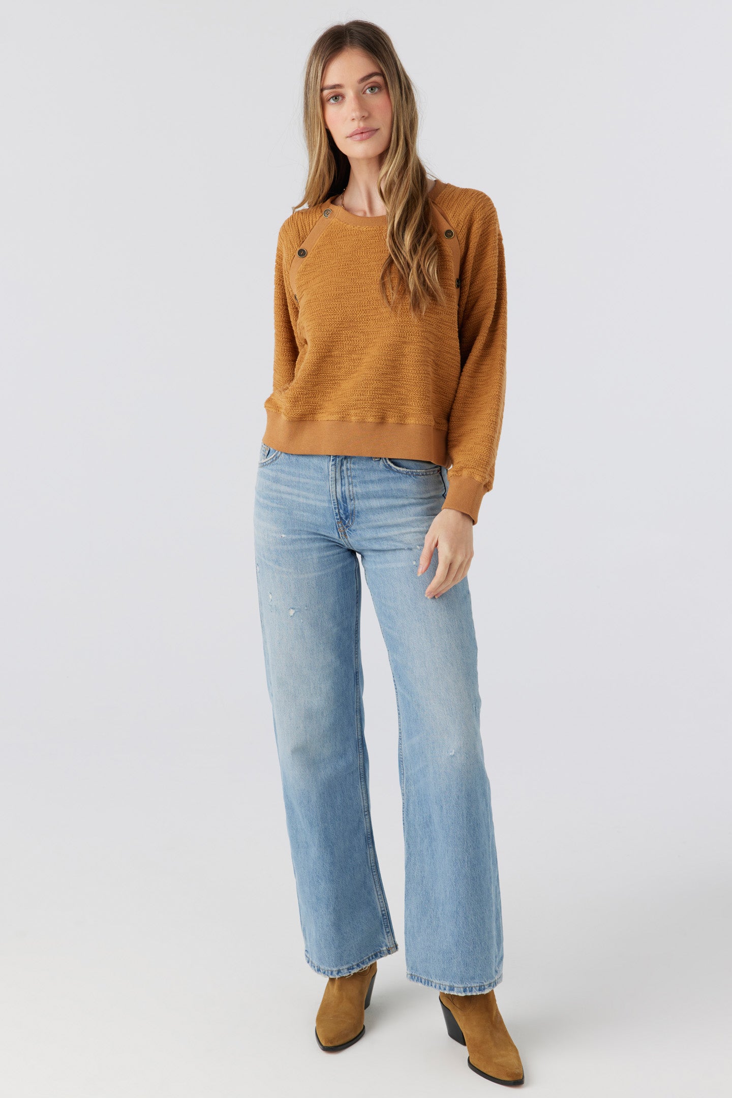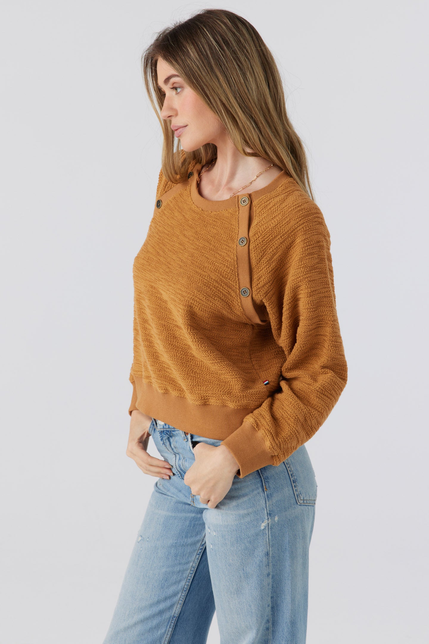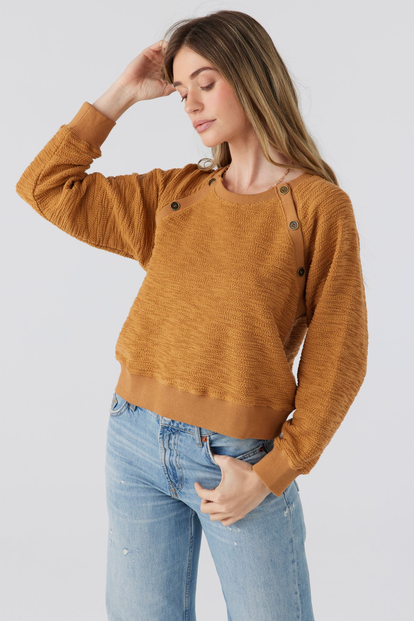 Designed to offer an elevated update to your basic pullover. Features rib raglan with decorative button details and rib trim at collar and sleeve cuff. The fit is easy throughout the body and sleeve and hem hits a waist band.