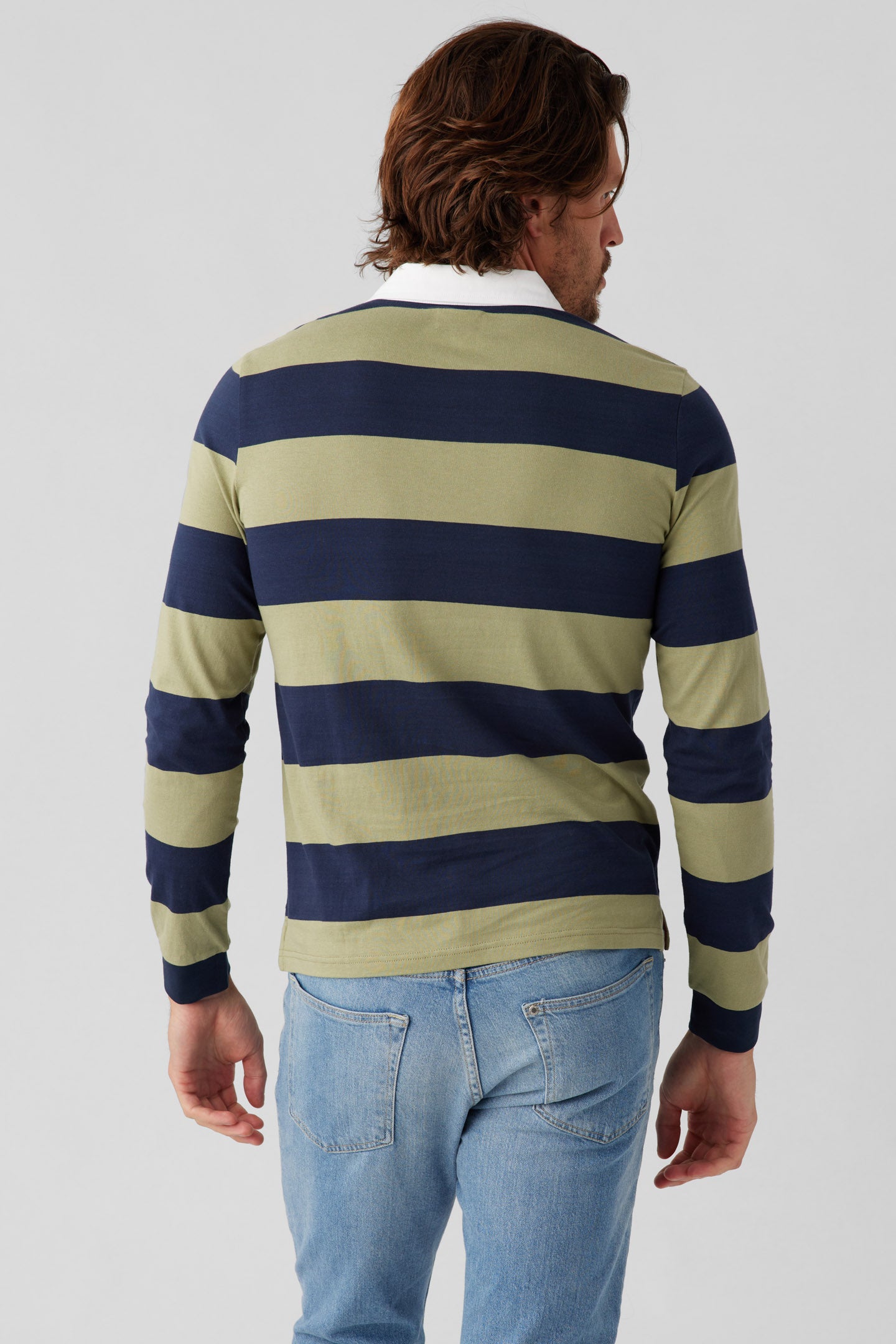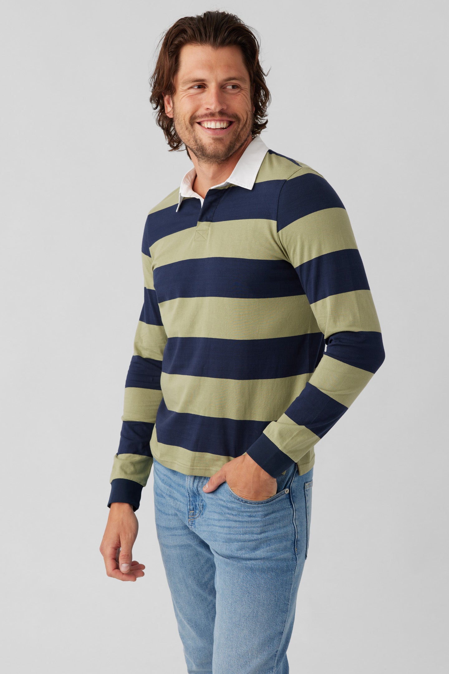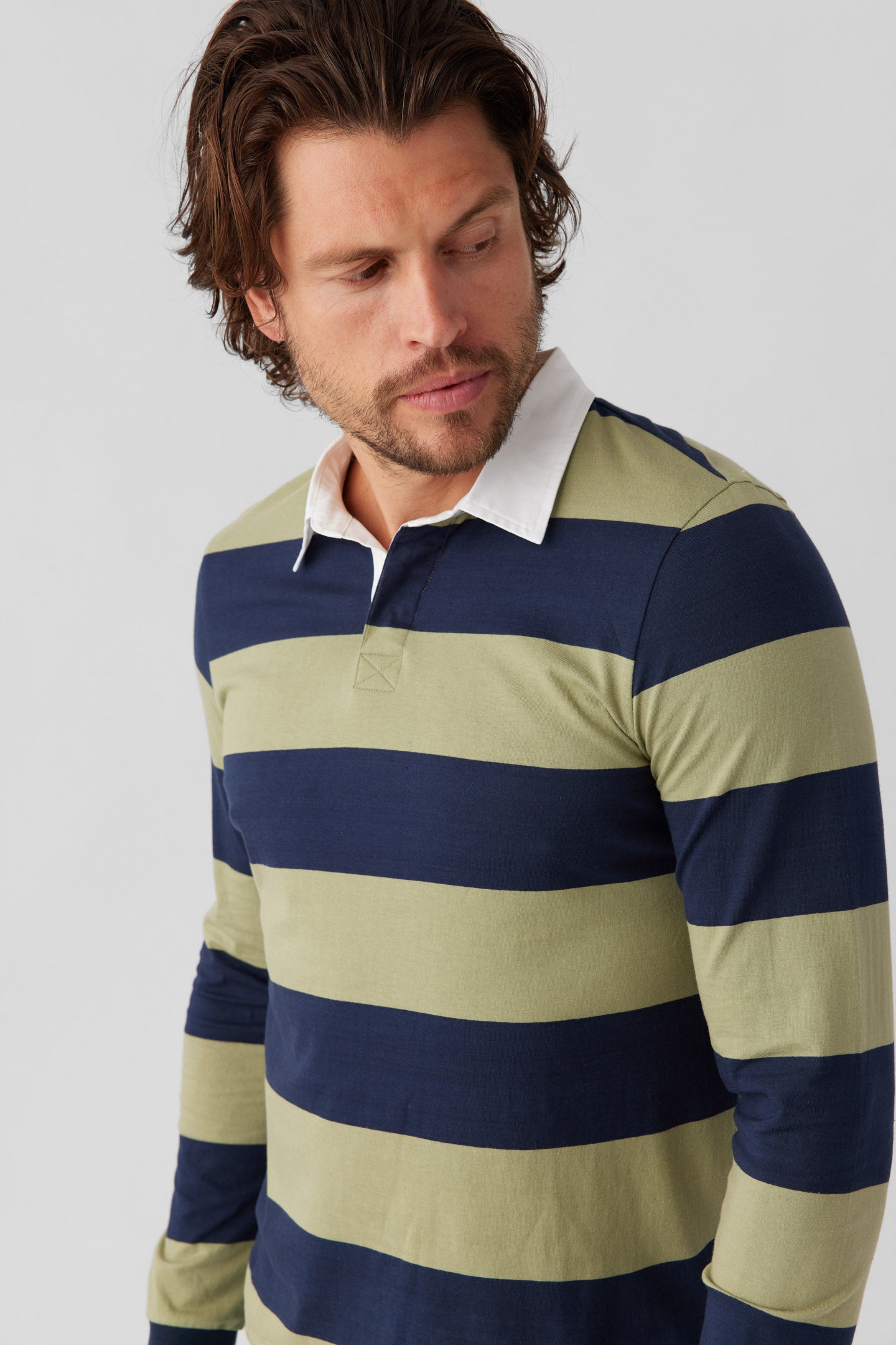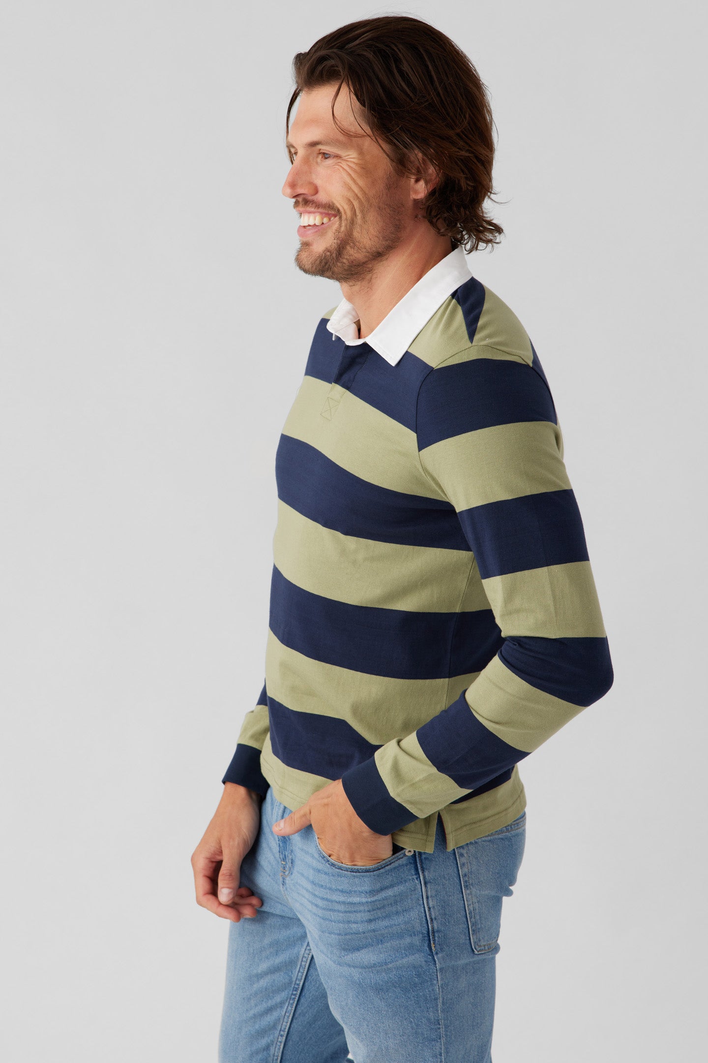 - Long sleeve Rugby Polo with rib at cuffs, side vent and woven contrast collar and henley placket.