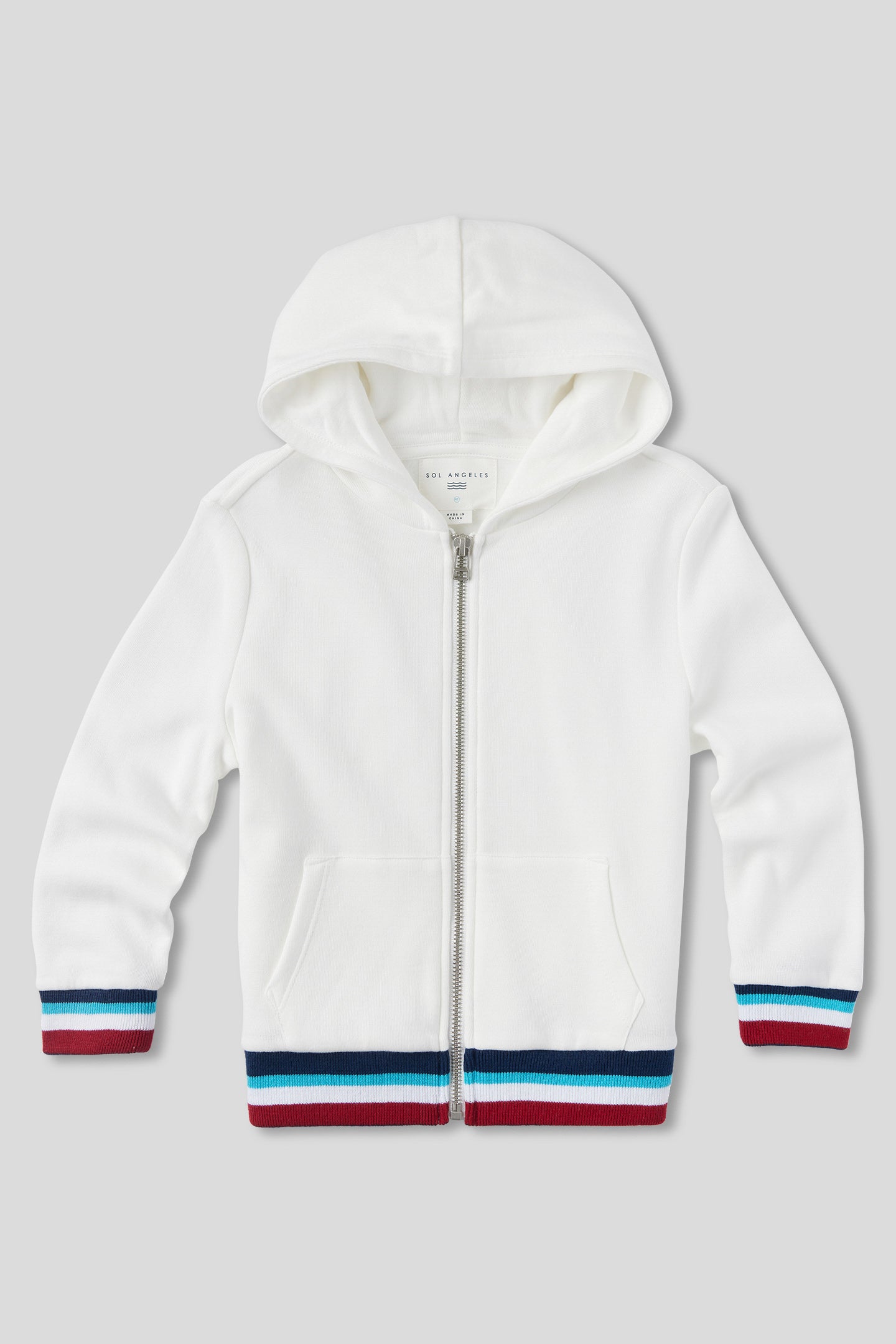 - Custom Sol Angeles colored stripe rib at hem & sleeve cuff with flag label at side seam.